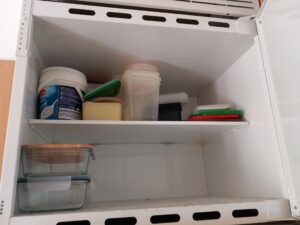 Förra veckan ändrade vi om i köket. Flyttade en massa burkar och lock till skåpet vi har över kylskåpet och satte in matreserver i skåpet där vi hade haft alla burkar.